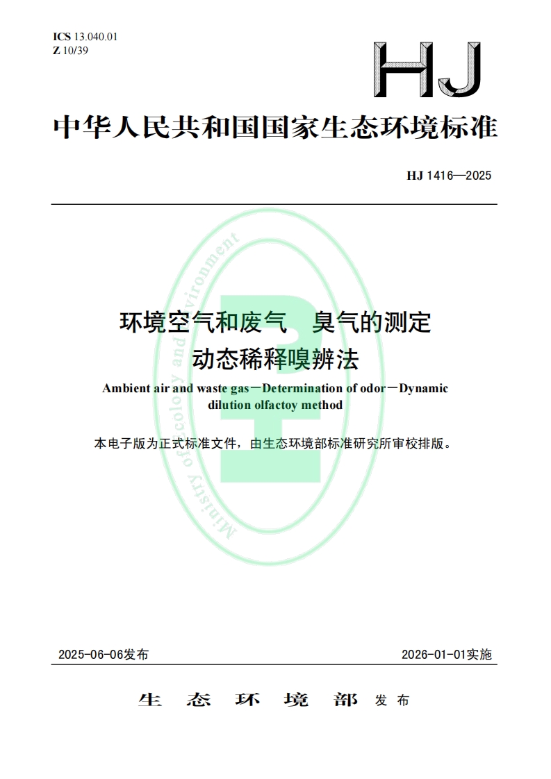 為規(guī)范環(huán)境空氣和廢氣中臭氣的測定方法,生態(tài)環(huán)境部近日發(fā)布了國家生態(tài)環(huán)境標(biāo)準(zhǔn)《環(huán)境空氣和廢氣 臭氣的測定 動態(tài)稀釋嗅辨法(HJ 1416—2025)》。本標(biāo)準(zhǔn)為首次發(fā)布,自2026年1月1日起實施。