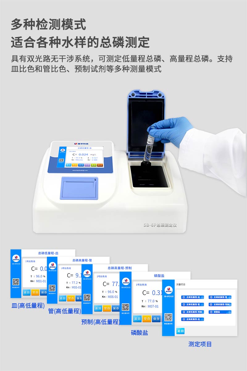 1、多種測(cè)定模式:具有雙光路無(wú)干涉系統(tǒng),可測(cè)定低量程總磷、高量程總磷。支持皿比色和管比色、預(yù)制試劑等多種測(cè)量模式;